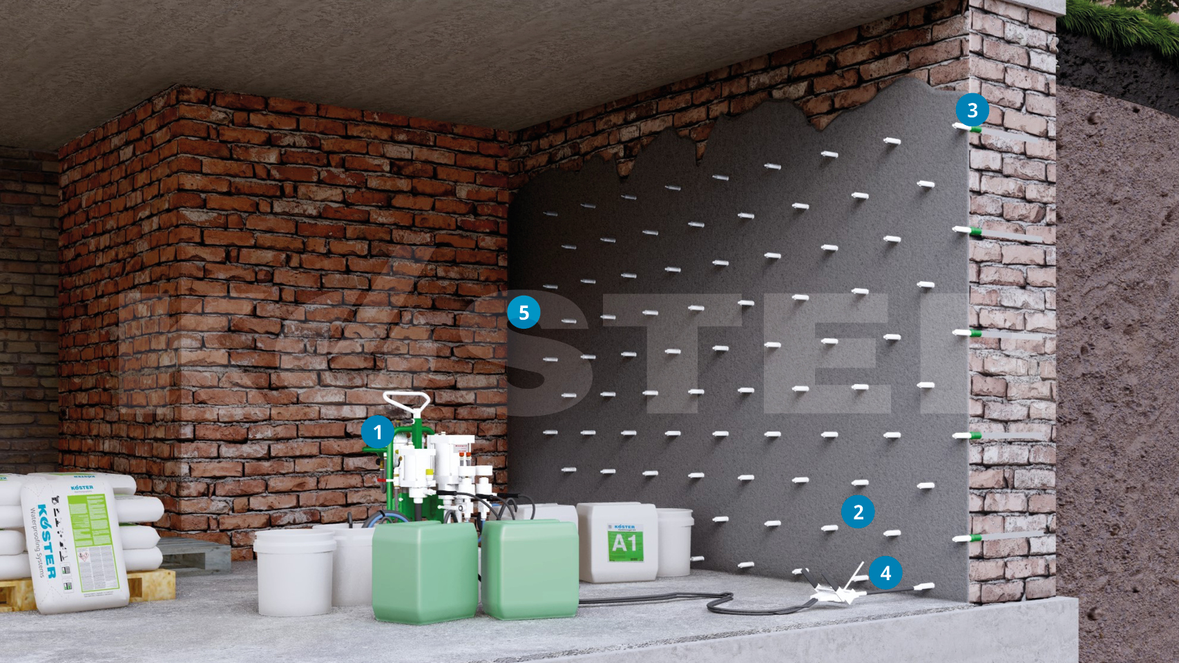 يتم إدخال عبوات KÖSTER Superpackers في فتحات الحفر. في معظم الحالات، من الضروري تركيب حاجز للحقن، على سبيل المثال باستخدام حاجز الحقن KÖSTER، وذلك لمنع فقدان مادة الحقن بسبب التدفق الخارجي غير المنضبط. في حالات البناء المكشوف حيث يجب الحفاظ على المظهر (كما هو الحال في الأقبية التاريخية)، يمكن استخدام KÖSTER Repair Mortar NC لإجراء اللمسات النهائية عند الحاجة، دون تغيير مظهر البناء بشكل كبير بدلاً من تثبيت حاجز حقن كامل.